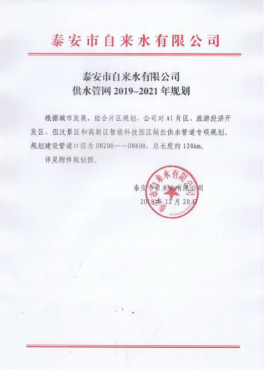 您当前位置》政策法规》市级》泰安市自来水有限公司供水管网2019-2021年规划