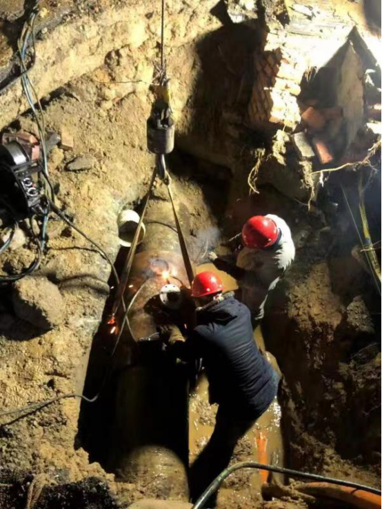 经过专业机械开挖,抢修人员准确确定管道暴漏原因为DN500铸铁管因气温急剧降低发生应力变化,造成金属管道突然断裂暴漏,断裂创面极不规则,只能现场特制钢制抱箍修复,抢修难度陡然增加。因损坏管道位置位于老城建成区内,地下各类管线错综复杂,机械难以展开,为加快管道抢修进度,公司邀请各相关管线单位现场指认各自管线,在确保安全的前提下使用人工为主、机械为辅的方法加紧抢修基坑开挖,抢修人员们歇人不歇岗,在狭小的工作面内轮番奋战,确保抢修进度。