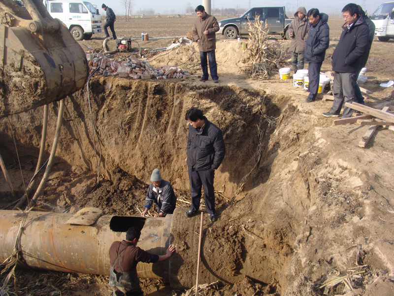 5555到达现场后发现,管道老化导致直径1000mm的供水主管线发生爆管,为减少损失,工作人员先先关闸止水。由于爆管发生在农田里,村民不配合,给抢修工作带来很大压力,经多次协商同意后,公司调来挖掘机挖掘工作坑,克服了土质松软,边挖边塌陷等不利因素,维修人员终于将一个长12米、宽8米、深6米的工作坑挖好,发现在主供水管线上被顶破一个直径400mm左右的洞。