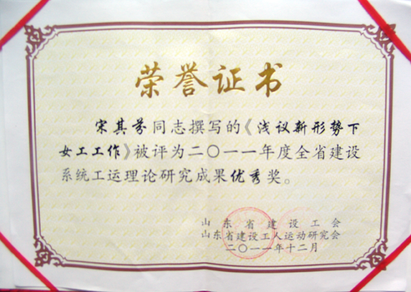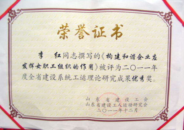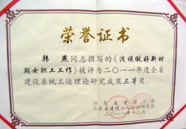 12月2日,山东省建设工会对2011年度优秀工运理论研究成果进行表彰和通报,我公司共有三名同志获奖,韩燕同志撰写的《浅谈做好新时期女职工工作》荣获三等奖;李红同志撰写的《构建和谐企业应发挥女职工组织的作用》和宋其芬同志撰写的《浅谈新形势下女工工作》荣获优秀奖。