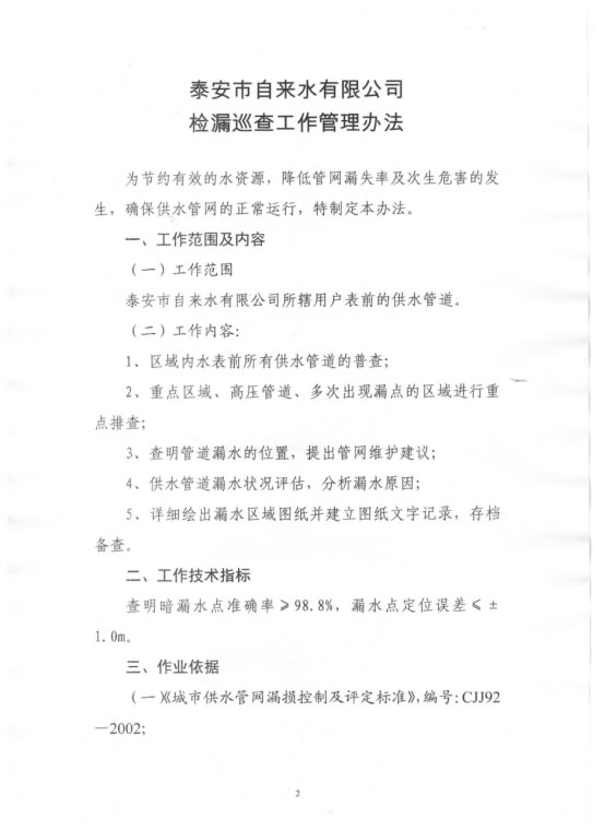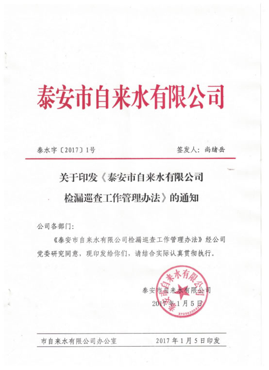 您当前位置》政策法规》市级》关于印发《泰安市自来水有限公司检漏巡查工作管理办法》的通知