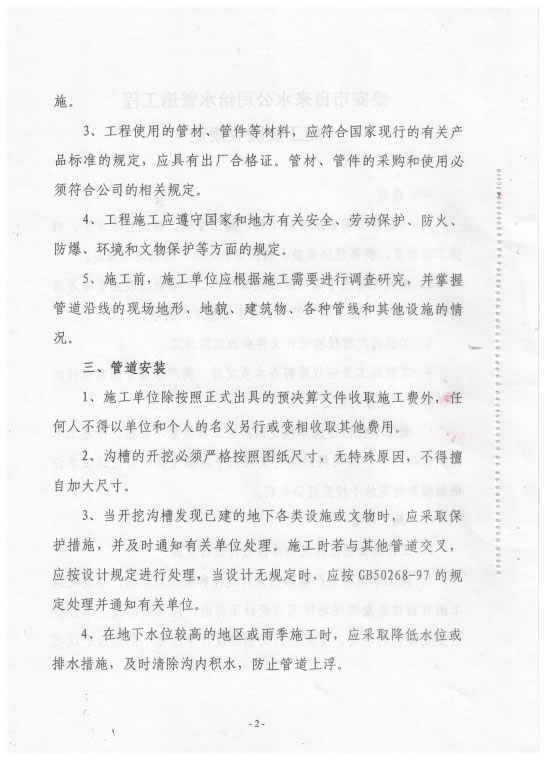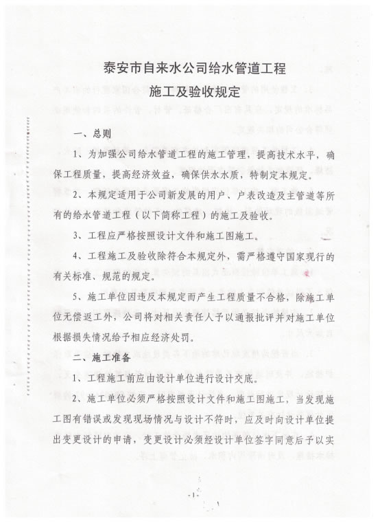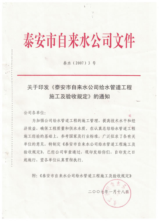 关于印发《泰安市自来水公司给水管道工程施工及验收规定》的通知